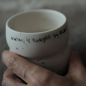 Decoration — air brush underglaze drawings and a quote by Emily Dickinson, "Water, is taught by thirst"
